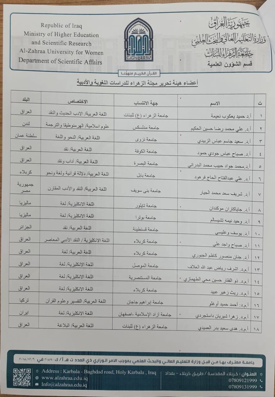 Professor Dr. Muhammad Jawad Habib Al-Badrani, a lecturer at the University of Basra / College of Education - Qurna, was chosen as a member of the editorial board of Al-Zahraa Journal for Linguistic and Literary Studies, which is a peer-reviewed scientific journal issued by Al-Zahraa University for Girls.