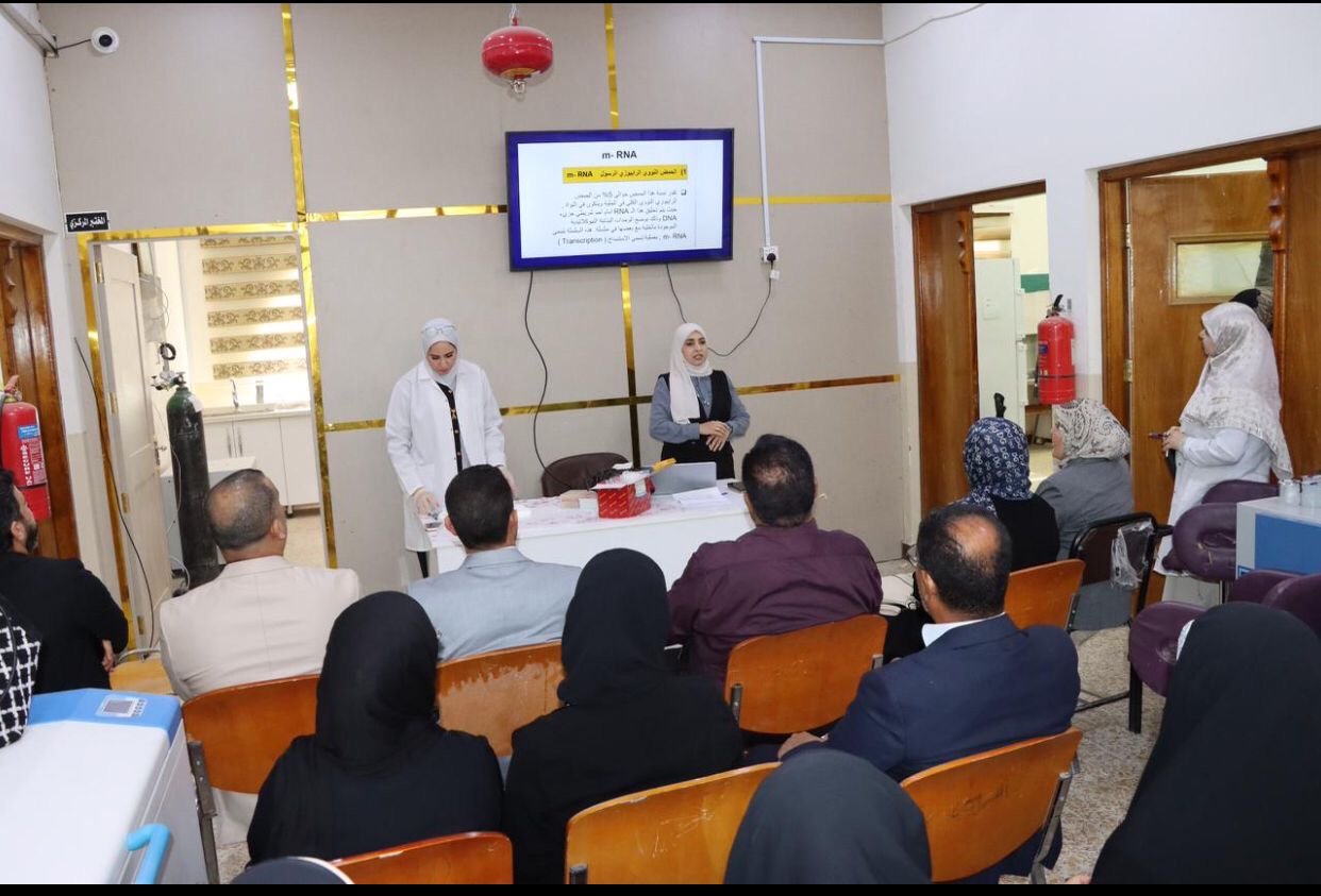 The workshop was presented by Dr. Adnan Bader Ghalib, Dr. Anwar Nouri Ayoub, and Dr. Hind Adnan Nouri. It included a theoretical component that covered the components of blood and the functions of its cells, in addition to explaining the structure of the genetic material, its functions, and its locations within the cell, and clarifying the fundamental differences between DNA and RNA.