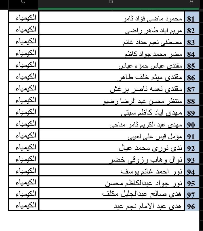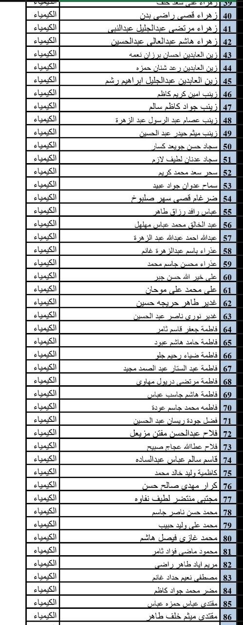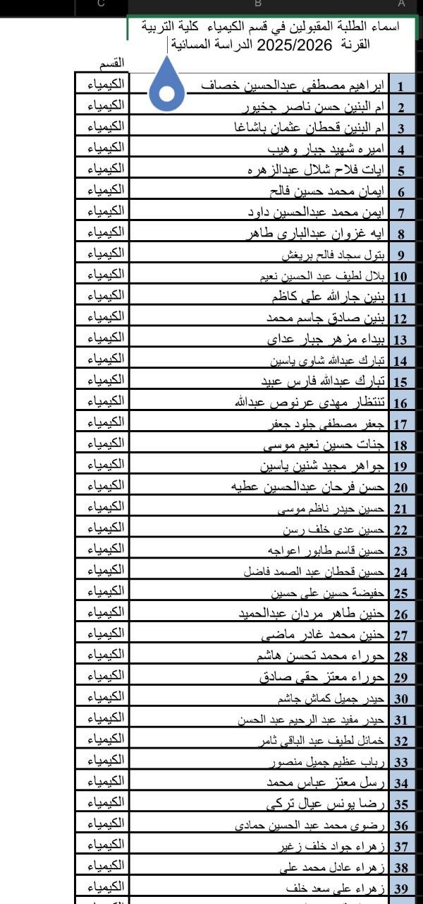 The College of Education/Al-Qurnah announces the names of students accepted in the Evening Study - Department of Chemistry for the academic year 2025-2026, and calls upon them to expedite the completion of registration requirements during Monday, Tuesday, Wednesday, and Thursday of the current week.