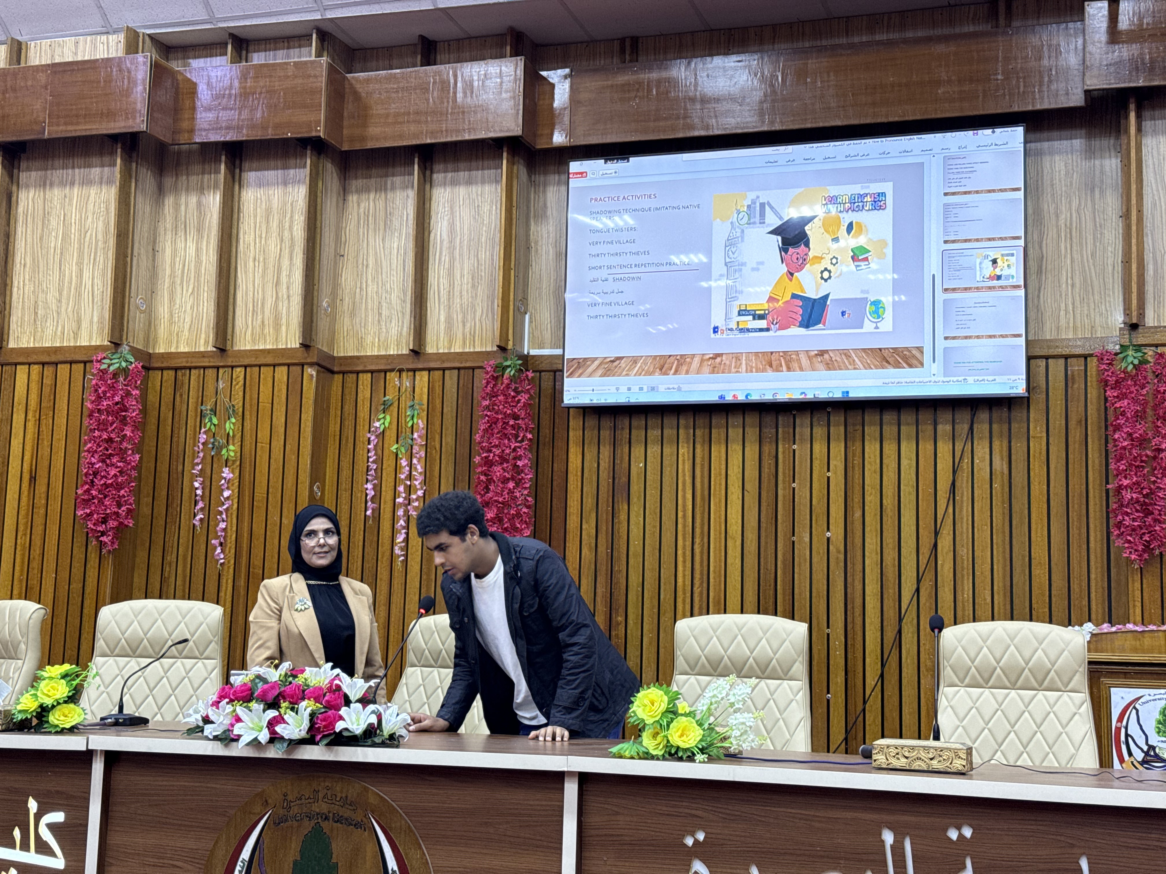 The seminar was presented by the lecturer Ms. Amal Salman Mishri, who discussed the importance of natural pronunciation as one of the essential components for effective communication in foreign languages. She explained that natural pronunciation goes beyond merely producing sounds correctly to include stress, rhythm, and intonation, representing the speech patterns used by native speakers in their daily contexts.