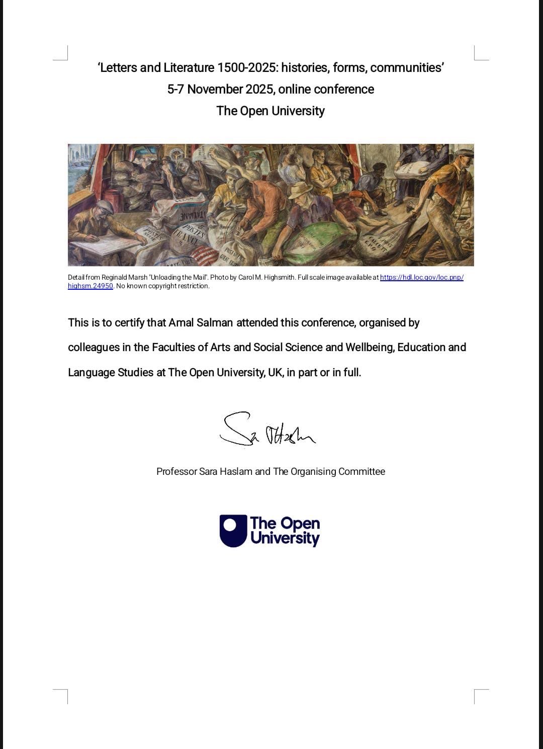 The lecturer Ms. Amal Salman Mishri from the College of Education/Al-Qurnah at the University of Basra participated in an International Electronic Conference organized by The Open University in the United Kingdom, held from October 5 to 7, 2025. The conference was titled:
