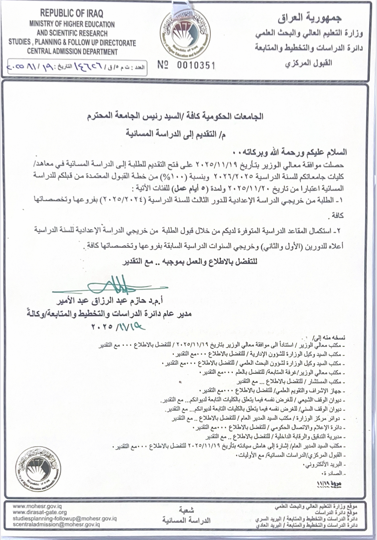 The Ministry of Higher Education and Scientific Research announced the approval of His Excellency the Minister to open the application window for third-round high school graduates for the 2024/2025 academic year. This is part of the expansion plan for admission into the Evening Study program at 100% of the maximum capacity.