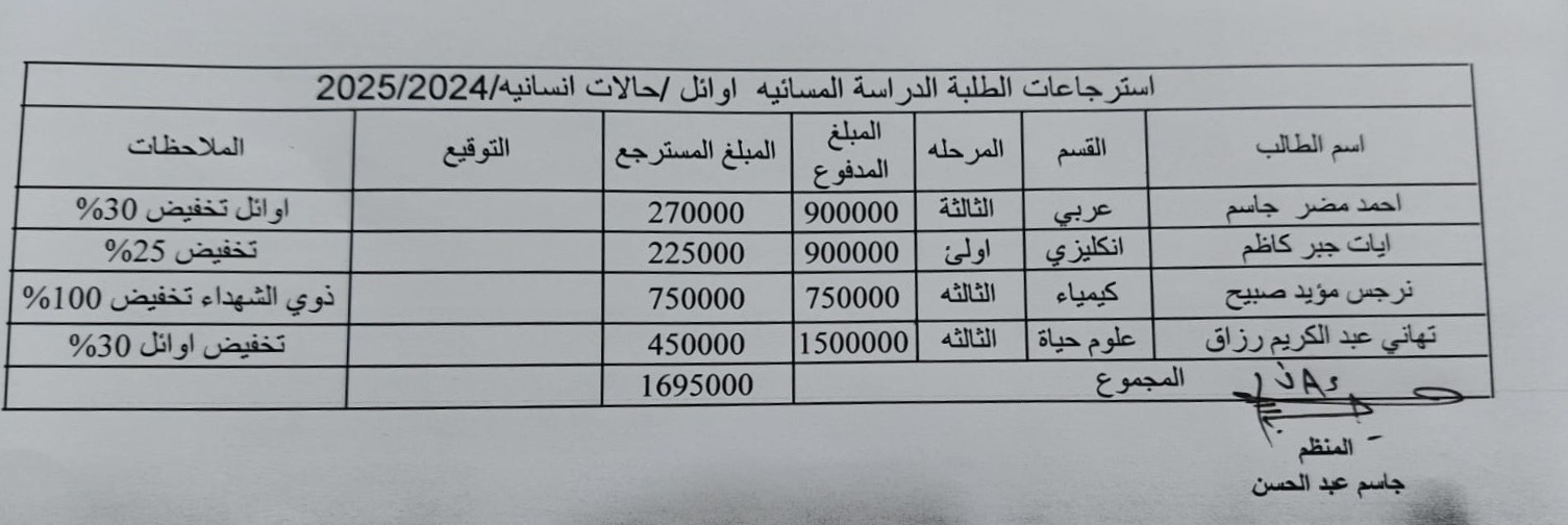 College of Education – Al-Qurna Announces Tuition Fee Refunds for Evening Study Students